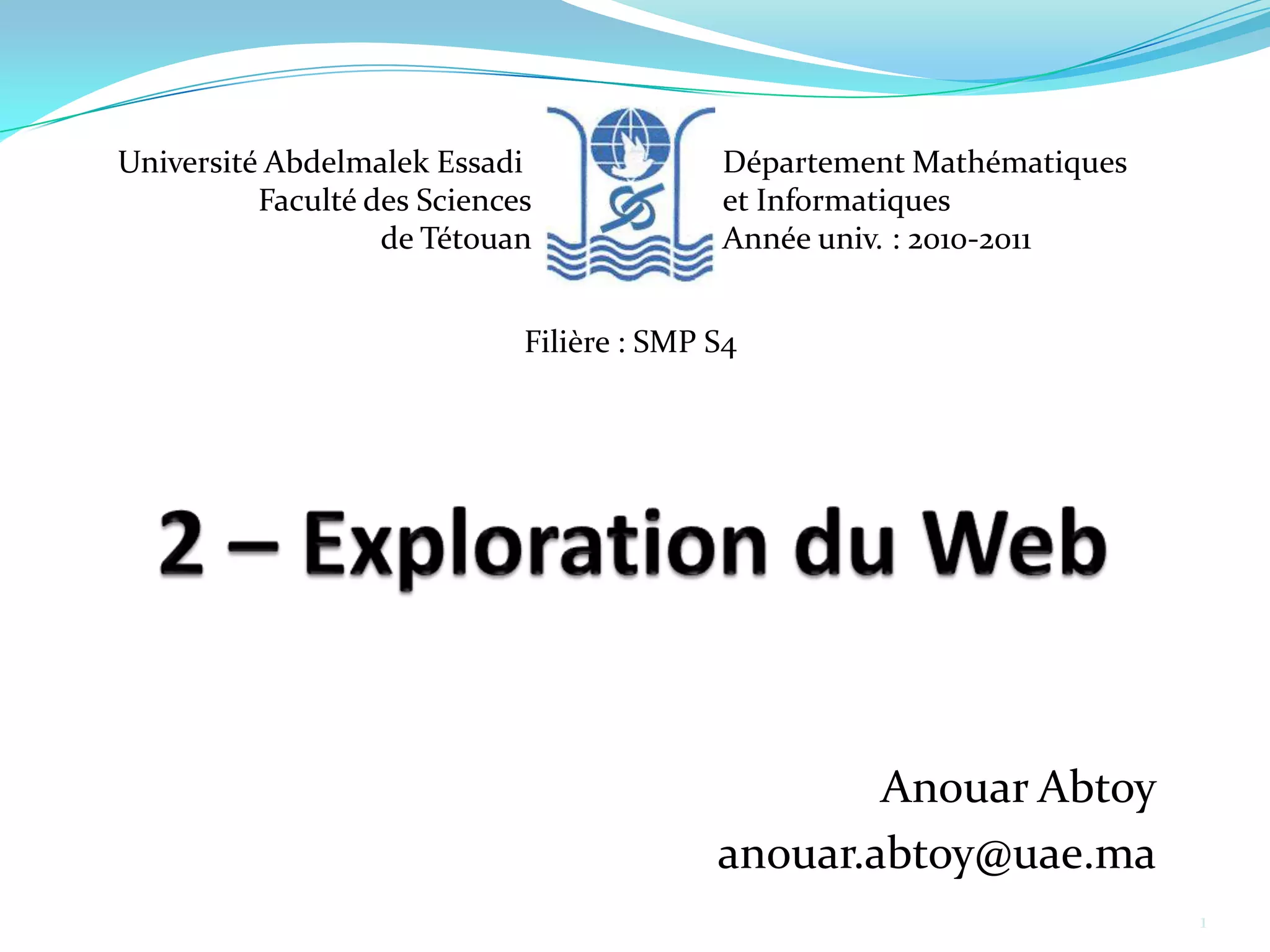 Le document traite de l'exploration du web et de l'histoire d'internet, en expliquant son évolution depuis ARPANET jusqu'au WWW. Il aborde également la distinction entre le web visible et le web invisible, ainsi que les outils et techniques de recherche d'information en ligne. Enfin, il décrit les différents types de moteurs de recherche et d'annuaires, ainsi que des méthodologies pour optimiser les recherches sur internet.