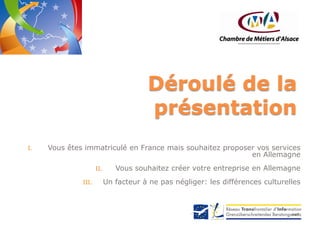 La réunion d'information aborde les démarches et formalités nécessaires pour les artisans et commerçants souhaitant exercer en Allemagne, tout en soulignant l'importance des différences culturelles entre la France et l'Allemagne. Elle informe sur les obligations légales, telles que l'attestation et la déclaration de détachement, ainsi que sur les procédures de création d'entreprise. Les participants peuvent également se renseigner sur les secteurs économiques et les styles de management distincts des deux pays.