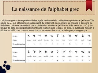 L'alphabet grec a émergé après l'effondrement de la civilisation mycénienne, remplaçant l'écriture linéaire B. Cette évolution a nécessité des modifications du syllabaire minoen, afin de transcrire les sons de la langue proto-grecque. L'alphabet a été constitué de nouvelles consonnes liées à cette adaptation linguistique.