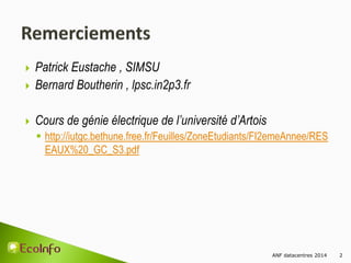 Le document présente un cours sur l'électricité et les datacentres, abordant des concepts fondamentaux tels que l'atome, les conducteurs, et le courant électrique. Il détaille également les types de circuits, les puissances (active, réactive, apparente), et l'importance des transformateurs dans la distribution de l'électricité. Enfin, il discute des systèmes d'alimentation sans interruption (ASI) et des variations entre courant continu et alternatif.