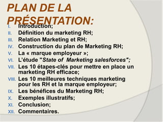 La présentation aborde le marketing des ressources humaines (RH) comme un processus clé pour attirer et fidéliser les talents dans les organisations. Elle décrit les étapes essentielles pour développer une stratégie de marketing RH efficace, ainsi que les techniques et outils nécessaires pour optimiser l'image de l'employeur et créer une relation durable avec les collaborateurs. Le document souligne enfin les bénéfices du marketing RH et son rôle croissant dans la gestion des ressources humaines.