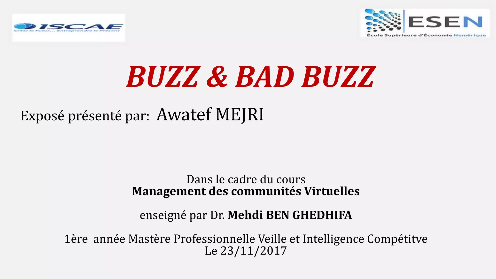 L'exposé présente le concept de buzz et bad buzz en marketing, en détaillant leurs techniques, leur propagation sur les réseaux sociaux et l'importance du buzz monitoring. Le bad buzz, phénomène négatif amplifié par Internet, pose des défis pour les marques, nécessitant une gestion de crise efficace. Des exemples de buzz réussis et des crises notables illustrent l'évolution des tendances en matière de communication digitale.