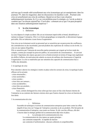 Le document traite des stratégies à adopter en période de crise économique, en définissant le concept de crise, ses typologies et l'importance de la communication de crise. Il présente des stratégies telles que les alliances, le partenariat, et la croissance externe, tout en soulignant les défis et opportunités créés par la crise. Enfin, le texte discute de la nécessité de s'adapter aux attentes du marché pour maintenir un avantage concurrentiel.