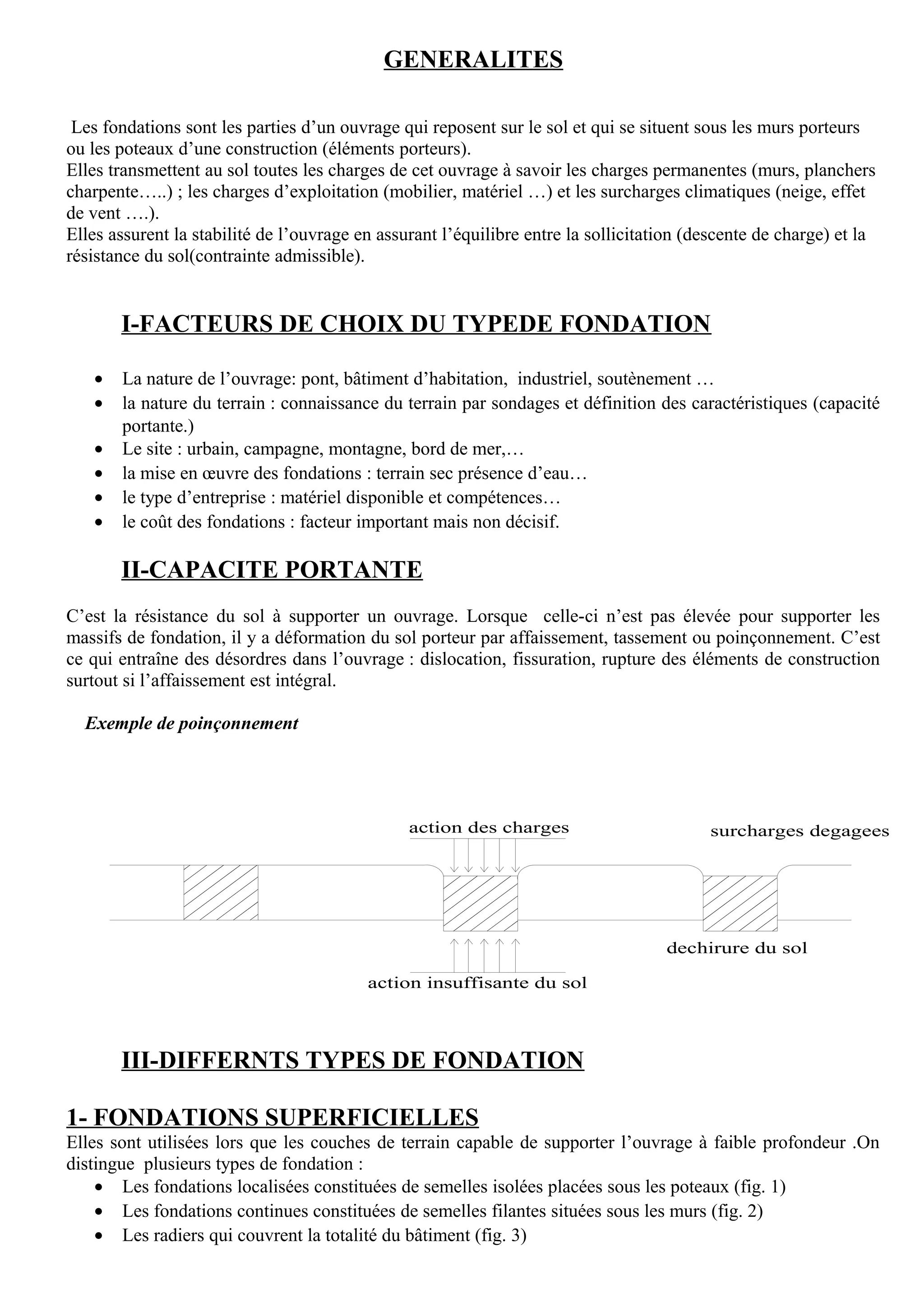 Les fondations assurent la stabilité d'un bâtiment en transmettant les charges au sol et en tenant compte de facteurs comme la nature de l'ouvrage et du terrain. On distingue principalement les fondations superficielles, adaptées à des couches de sol peu profondes, et les fondations profondes, nécessaires lorsque le sol capable de supporter l'ouvrage se trouve à grande profondeur. Différents types de fondations incluent les semelles isolées, les semelles continues, et les pieux, chacune ayant des caractéristiques spécifiques en fonction des conditions du site et des charges à supporter.