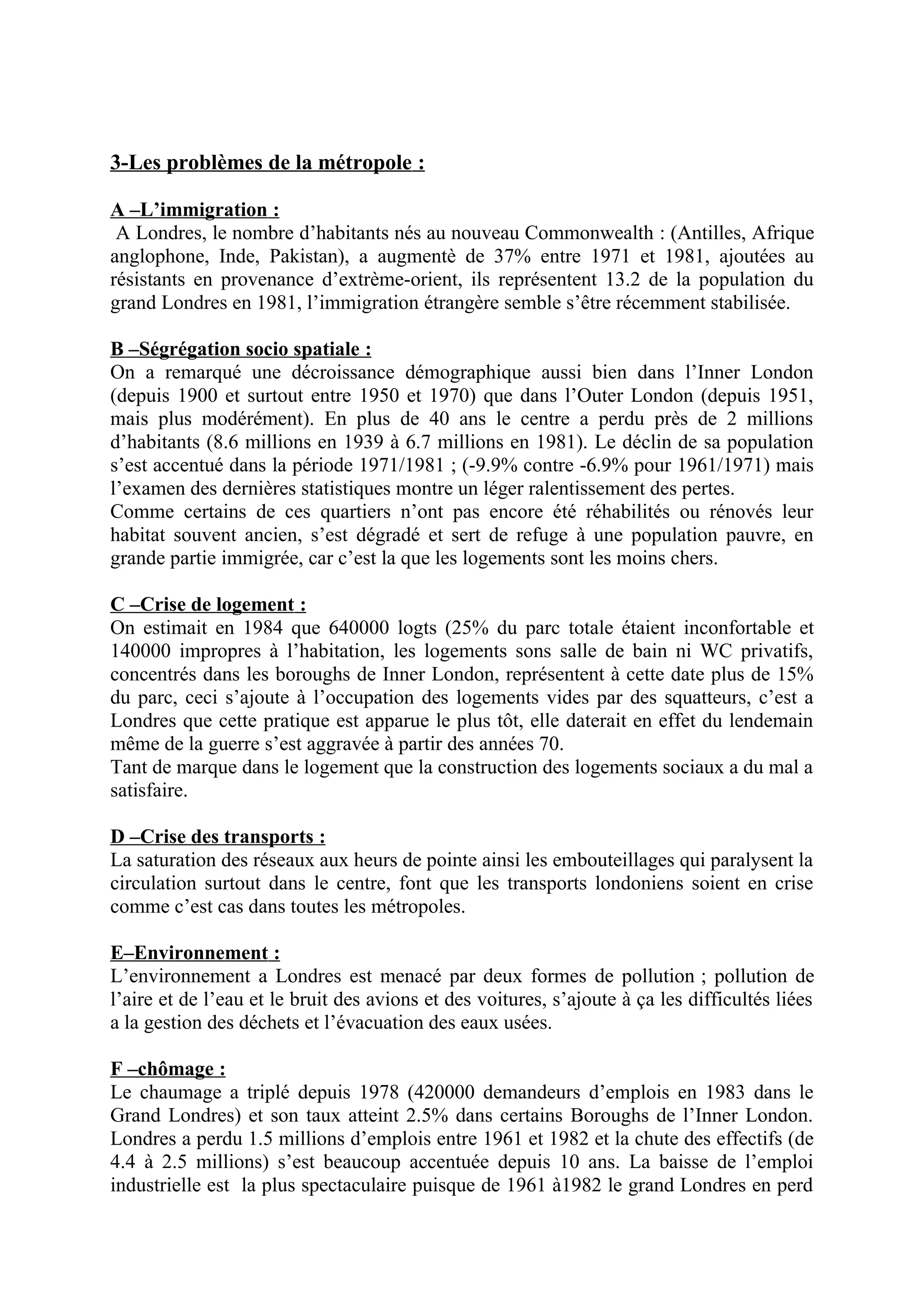 Le document aborde les problèmes majeurs de Londres, y compris l'immigration croissante, la ségrégation socio-spatiale, une crise du logement, et la hausse de la criminalité. Il souligne également la nécessité d'une réorganisation urbaine pour faire face aux défis de congestion et aux inégalités entre lieux de résidence et d'emploi. Enfin, il plaide pour une planification urbaine réfléchie afin de protéger les métropoles contre leurs propres dysfonctionnements.