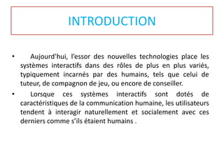 Le document présente le modèle computationnel d'émotion Fatima, utilisé pour créer des agents conversationnels animés capables d'interagir de manière naturelle avec les utilisateurs. Il décrit également deux agents pédagogiques, Steve et Adele, et examine les mécanismes de déclenchement des émotions basés sur le modèle OCC. Malgré ses avancées, le modèle Fatima ne gère pas efficacement l'influence de la personnalité sur les émotions et les décisions de l'agent.