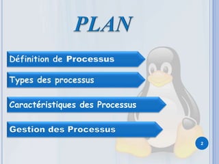Le document traite des caractéristiques des processus dans un système d'exploitation, en distinguant les processus système et les processus utilisateurs. Il explore les états des processus, les mécanismes d'ordonnancement, la création et la terminaison des processus, ainsi que la gestion de la communication entre eux à l'aide de signaux. Enfin, il décrit diverses commandes Unix utilisées pour surveiller et gérer les processus en cours d'exécution.