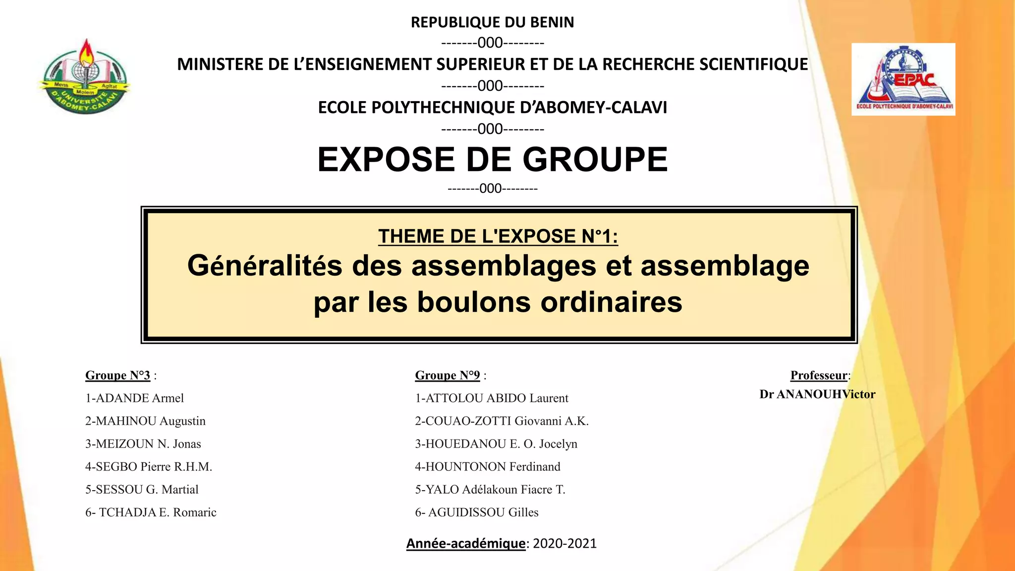 L'exposé traite des assemblages boulonnés en construction métallique, leur fonctionnement, caractéristiques et précautions constructives nécessaires. Il aborde également les dimensions et les spécificités des boulons ordinaires ainsi que des études de cas sur leur application. Enfin, il souligne les méthodes de calcul pour la résistance au cisaillement et à la traction des boulons.