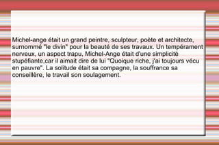 Michel-Ange, né en 1475 en Toscane, était un artiste multifacette de la Renaissance italienne, reconnu pour ses œuvres emblématiques telles que "David", "La Pietà" et les fresques de la chapelle Sixtine. Malgré ses succès, il a mené une vie de solitude et de travail, souhaitant rester humble malgré sa renommée. Architecte de la basilique Saint-Pierre et du palais Farnèse, son impact sur l'art et l'architecture demeure inégalé.
