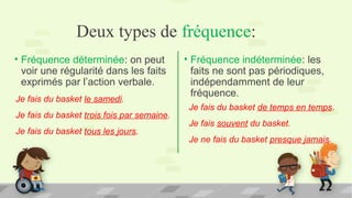 Le document présente deux types de fréquence en français : la fréquence déterminée, qui exprime des actions régulières, et la fréquence indéterminée, qui décrit des faits non périodiques. Des exemples illustrent chaque type de fréquence, comme des actions effectuées quotidiennement ou occasionnellement. La distinction est faite à travers des expressions variées indiquant la régularité ou l'irrégularité de ces actions.