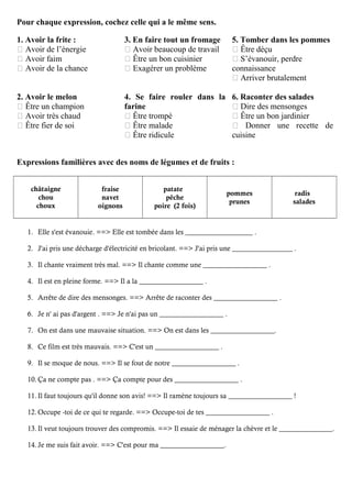 Le document présente des expressions en lien avec les légumes et leurs synonymes à travers des exemples et des exercices de complétion. Il inclut également des expressions familières avec des noms de légumes et de fruits, et demande aux utilisateurs de faire des associations de sens. Enfin, il fournit des situations concrètes où ces expressions peuvent être appliquées.