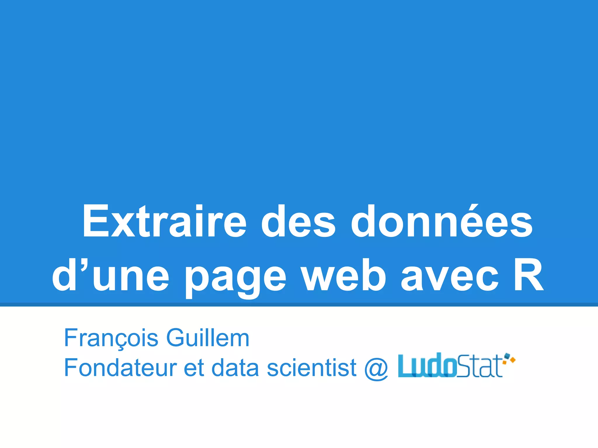 Ce document explique comment extraire des données d'une page web en utilisant R, en se concentrant sur des méthodes telles que 'readHTMLTable' et le package 'css'. Il fournit également des détails sur la structure d'un document HTML, les attributs et les sélecteurs CSS nécessaires pour cibler des éléments précis. En conclusion, il encourage l'utilisation d'outils de développement pour inspecter les éléments et faciliter l'extraction de données.