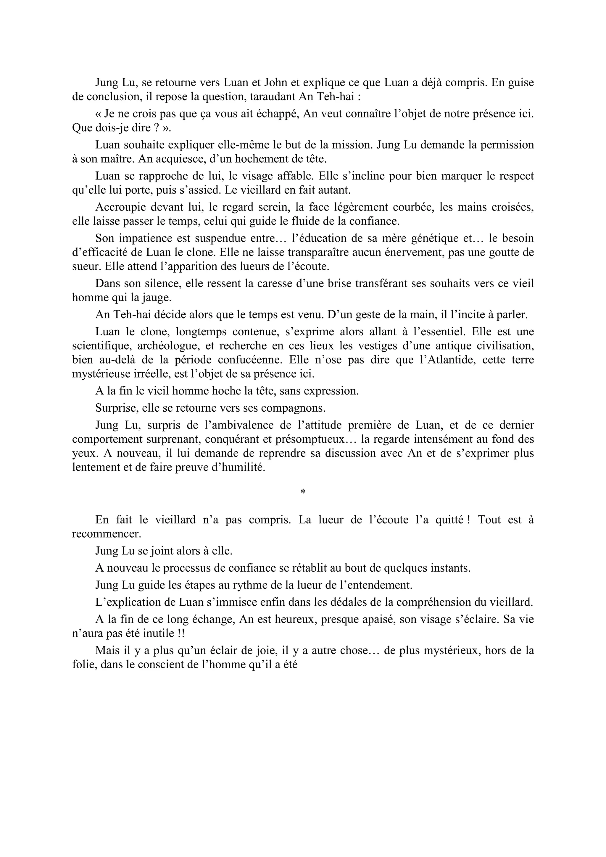 Luan, une scientifique et archéologue, explique à An teh-hai, un vieillard, le but de sa mission qui est de découvrir les vestiges d'une antique civilisation, tout en gardant secrète sa recherche sur l'Atlantide. Après un échange difficile due à l'incompréhension initiale, la confiance s'établit, permettant à Luan de communiquer efficacement. Finalement, An, satisfait, ressent une joie mystérieuse face à cet échange significatif.