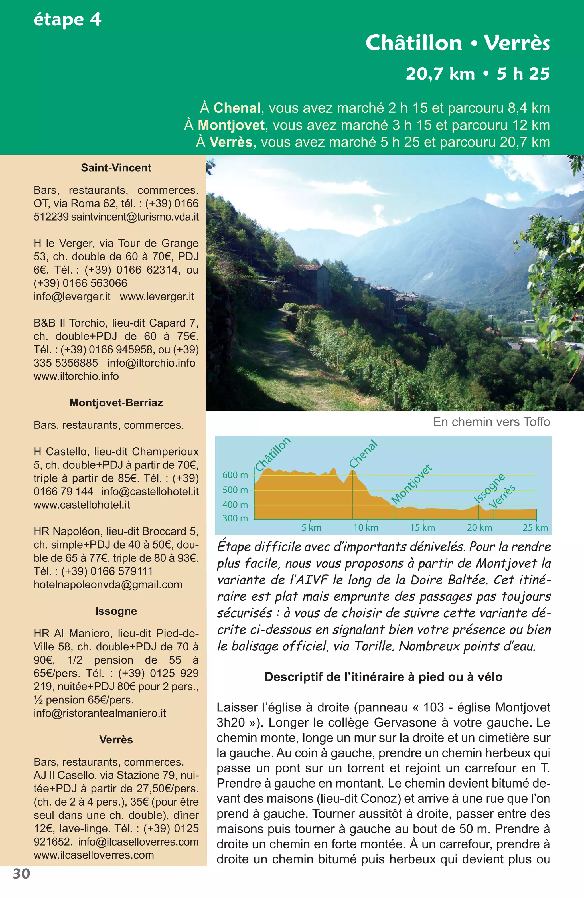 Le document décrit un itinéraire de randonnée et de cyclisme à travers plusieurs localités, avec des informations détaillées sur le parcours, les difficultés, et les choix de variantes. Il mentionne également des points d'intérêt tels que des hôtels, restaurants et attractions touristiques dans les villes de Saint-Vincent, Issogne et Verrès. En outre, il aborde l'histoire des sources thermales de Saint-Vincent et leur utilisation dans le traitement de divers maux.