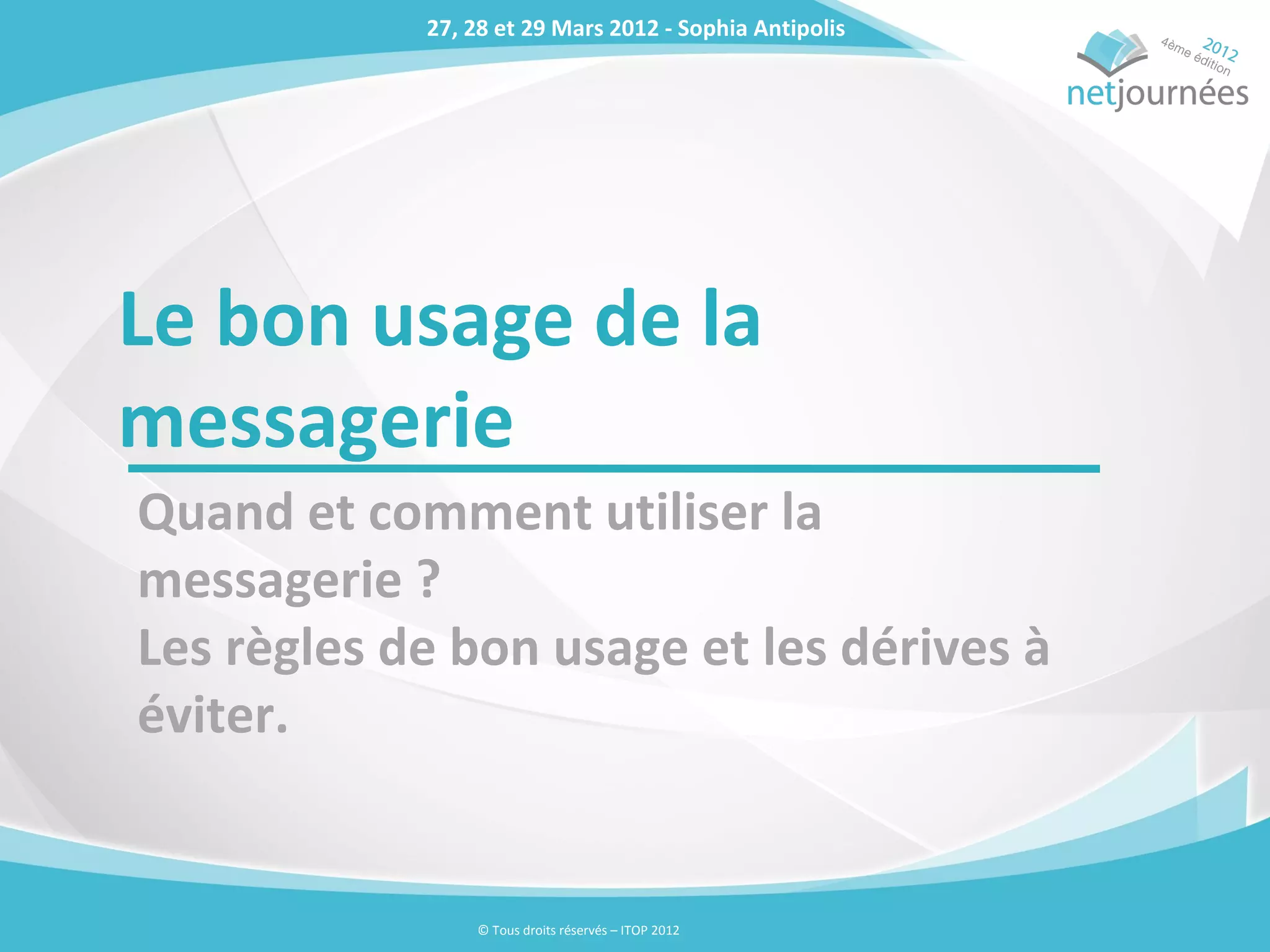 Le document présente les bonnes pratiques de l'utilisation de la messagerie dans un cadre scolaire, mettant en avant ses fonctionnalités telles que la communication rapide et asynchrone. Il aborde également les règles à suivre et les dérives à éviter tout en questionnant l'existence d'une charte d'utilisation. Des intervenants partagent des réflexions sur l'intégration de la messagerie au sein des établissements scolaires.