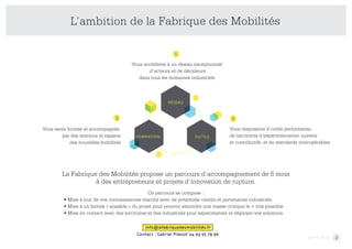 La Fabrique des Mobilités est le premier accélérateur européen dédié à l'innovation dans le secteur du transport et des mobilités, visant à rassembler divers acteurs pour favoriser l'émergence de nouvelles solutions. Elle propose un parcours d'accompagnement de 6 mois pour les startups et projets d'innovation, en mettant à disposition des ressources, des outils et des connexions stratégiques. Lancée en octobre 2015, la Fabrique est soutenue par plusieurs organismes, dont l'ADEME et le ministère des Transports.