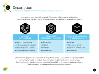 Le document traite des écosystèmes ouverts et innovants, favorisant la collaboration entre divers acteurs pour stimuler l'innovation. Il souligne l'importance de l'inclusivité, de la décentralisation et de la transparence dans ces écosystèmes, qui permettent de mutualiser les ressources et de créer des technologies communes. De nombreux exemples d'initiatives et d'alliances dans divers secteurs sont également présentés, illustrant l'impact croissant de ces approches sur la production d'innovation.