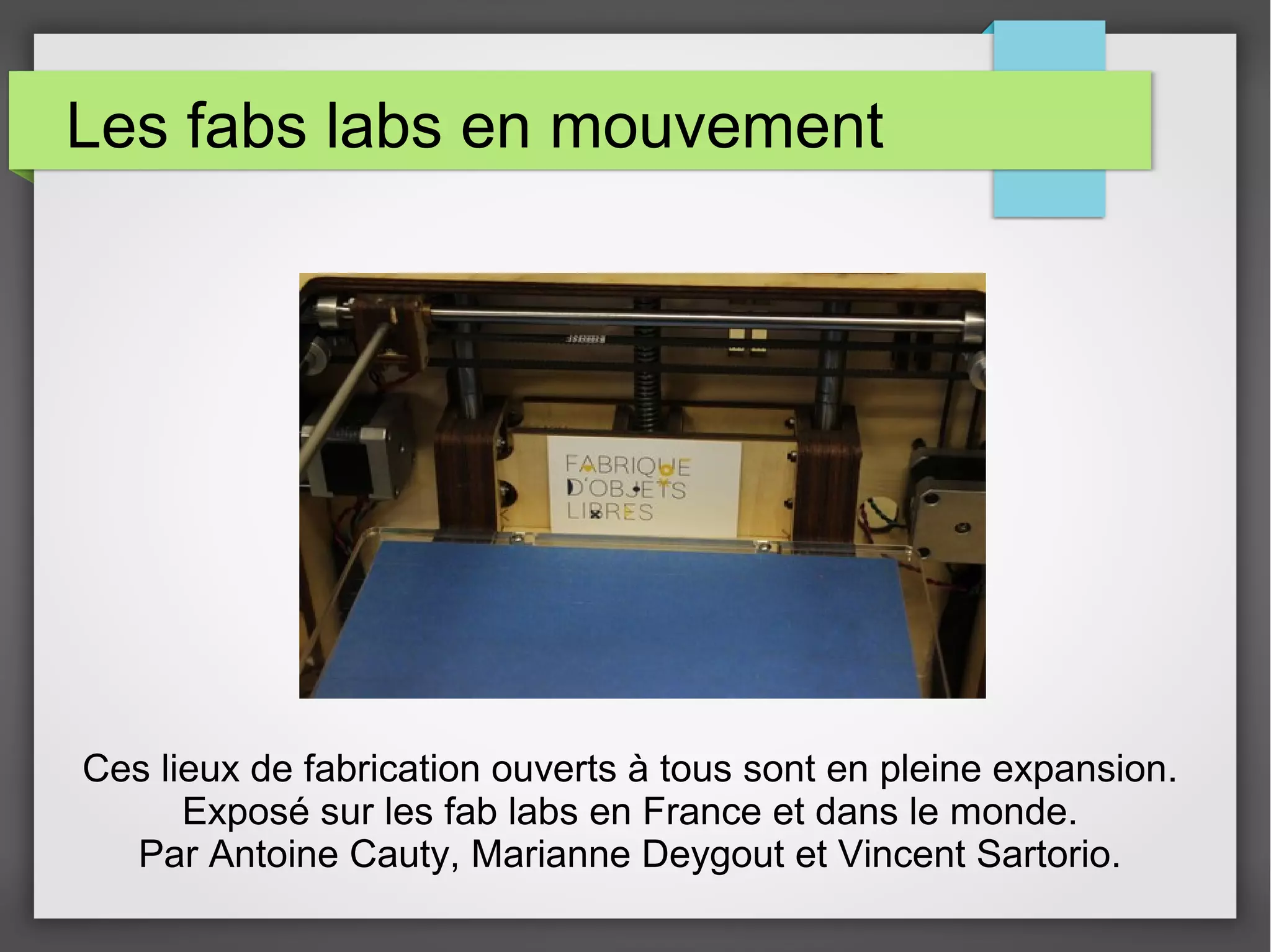 Les fab labs, espaces de fabrication numérique ouverts à tous, connaissent une expansion mondiale, notamment en France, où l'on en compte 160. Ces lieux favorisent la démocratisation de la fabrication, s'appuyant sur des outils numériques tels que l'imprimante 3D et des logiciels open source. Cependant, des limites existent, comme le manque d'ouverture internationale et des préoccupations en matière de sécurité et d'environnement liées à l'utilisation de certaines technologies.