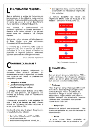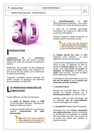L'impression 3D, ou fabrication additive, utilise divers procédés tels que le dépôt de filament fondu, la stéréolithographie et le frittage sélectif par laser pour créer des objets en superposant des couches de matière selon un fichier 3D. Destinée au prototypage rapide et à la production de pièces fonctionnelles, cette technologie est accessible aux PME et a des applications dans des secteurs variés comme l'aéronautique et la médecine. La démocratisation de l'impression 3D soulève des questions juridiques sur la propriété intellectuelle et nécessite des réflexions sur sa normalisation.