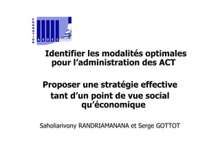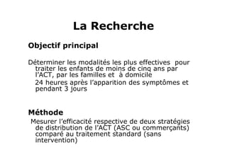 Cette recherche vise à déterminer les modalités optimales pour administrer l'artémisinine combinée (ACT) aux enfants de moins de cinq ans en zone endémique, en comparant des stratégies de distribution différentes. Les résultats montrent que l'automédication est largement pratiquée, mais que le traitement en consultation médicale reste faible, tandis que le commerçant est le principal fournisseur de médicaments dans ces zones. L'étude souligne également l'importance de l'observance des traitements et le rôle des pratiques traditionnelles dans la gestion des épisodes fébriles.