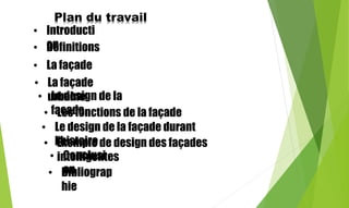 Le document traite du design des façades urbaines, soulignant leur rôle essentiel dans l'esthétique et l'identité architecturale des bâtiments. Il explore l'évolution historique du design des façades, des styles antiques aux conceptions modernes et intelligentes qui intègrent des technologies durables. Les exemples de façades innovantes, comme les tours Al Bahar et l'Institut du Monde Arabe, illustrent l'importance croissante de l'interaction entre l'architecture et l'environnement urbain.