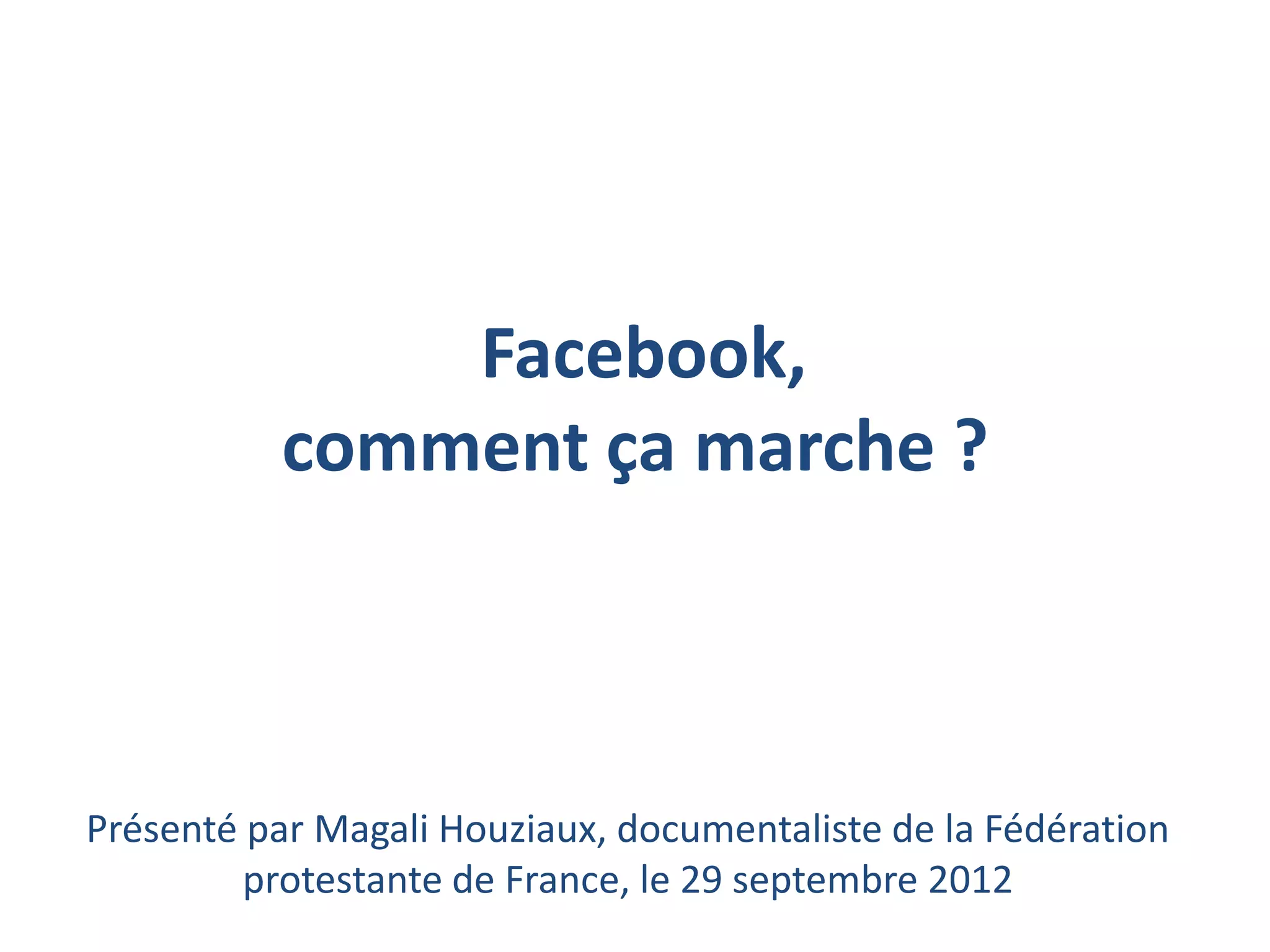 Le document présente un guide sur l'utilisation de Facebook, abordant des sujets tels que la création de profils, de pages, et la gestion de la sécurité et des paramètres de confidentialité. Il met en avant l'importance de Facebook pour des usages personnels et professionnels, tout en décrivant ses fonctionnalités clés et les méthodes pour interagir avec les utilisateurs. Des conseils pratiques pour optimiser l'engagement et la visibilité des publications sur la plateforme sont également inclus.