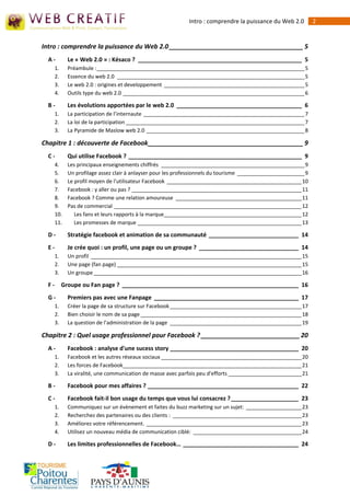 Le document explore la puissance et l'impact du Web 2.0, en mettant l'accent sur les outils collaboratifs et la participation des utilisateurs. Il se concentre également sur Facebook comme un exemple clé, en analysant son utilisation par les professionnels et en fournissant des conseils pour optimiser la présence en ligne. Les défis et les avantages liés à l'utilisation de Facebook pour des objectifs professionnels sont également abordés, tout en discutant des implications sur la vie privée.
