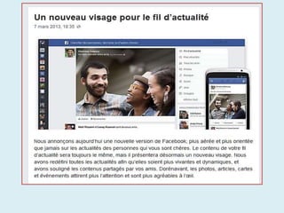 Le document traite des mises à jour récentes de Facebook, notamment une nouvelle interface adaptée aux différents écrans et divers fils d'actualité. Il souligne l'importance des paramètres de confidentialité pour protéger les informations personnelles des utilisateurs. Enfin, il offre des conseils sur la gestion des amis, des publications et l'entretien d'un réseau social efficace.
