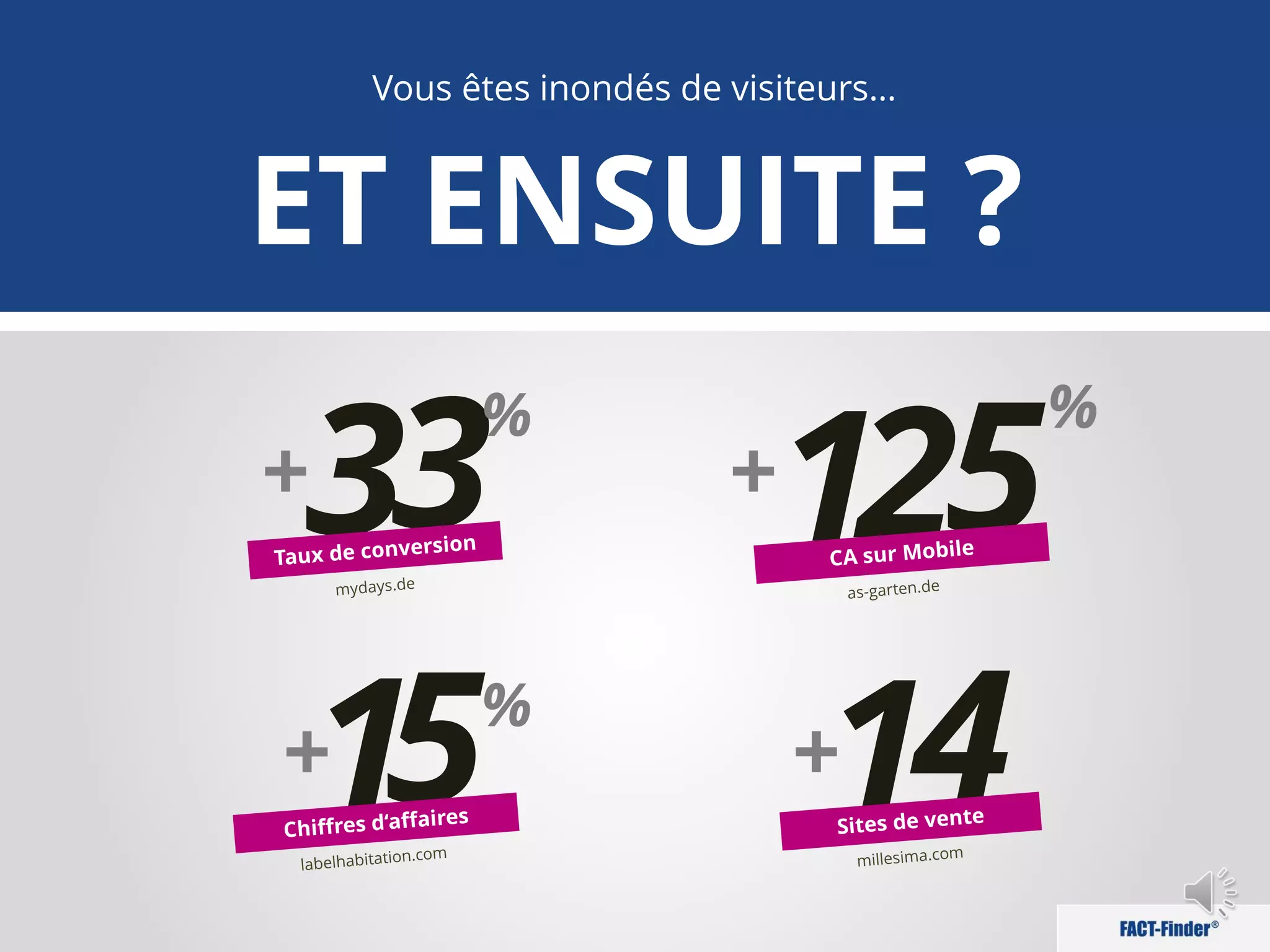Le document présente les solutions de fact-finder pour améliorer la conversion en ligne des e-marchands, avec plus de 1600 sites utilisant cette technologie. Fact-finder optimise la recherche produit à travers des algorithmes multilingues, des filtres dynamiques et une personnalisation basée sur le comportement des utilisateurs. L'objectif est d'augmenter l'efficacité des recherches et les ventes en offrant une expérience utilisateur améliorée.