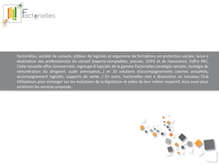 Factorielles lance une nouvelle offre commerciale, l'offre PAC, regroupant 8 logiciels et 10 solutions d'accompagnement pour les professionnels du conseil et de l'assurance. Cette initiative vise à répondre aux évolutions législatives et professionnelles, tout en renforçant le lien avec les clients via un club utilisateurs. L'offre PAC est proposée au prix de 249€ HT par mois, consolidant la position de Factorielles en tant qu'expert en protection sociale depuis 20 ans.