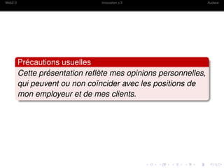 La présentation aborde les défis et innovations associés aux technologies Web 2.0 dans le domaine de l'éducation, en mettant l'accent sur la pédagogie, les outils numériques et les politiques en vigueur. Elle souligne l'importance d'innover et de s'adapter aux nouvelles réalités éducatives, tout en gérant les connaissances et l'apprentissage. Enfin, le document évoque la nécessité d'un leadership audacieux et d'une démocratisation de la technologie pour améliorer l'éducation.