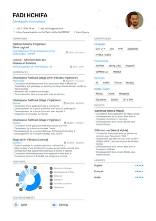 Fadi Hchifa est un développeur informatique basé à Paris, spécialisé en développement fullstack avec une expérience dans divers frameworks et technologies. Il a réalisé plusieurs stages dans des entreprises comme Phenix SAS et Zenlab, où il a participé à la conception et au développement d'applications web et mobile. Titulaire d'un diplôme d'ingénieur en génie logiciel, il parle anglais, français et arabe.