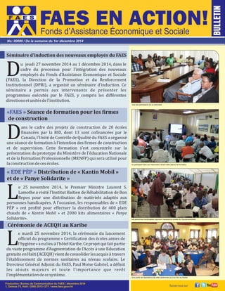 Le séminaire d'induction du Fonds d'Assistance Économique et Sociale (FAES) a eu lieu du 27 novembre au 1 décembre 2014, présentant les programmes et initiatives de l'institution. Des distributions alimentaires ont été réalisées pour les personnes handicapées, et un programme de certification des écoles amies de l'hygiène a été lancé pour améliorer l'accès à l'éducation en Haïti. Une rencontre d'évaluation a eu lieu avec le Fonds International de Développement Agricole (FIDA) pour optimiser les opérations sur le terrain.