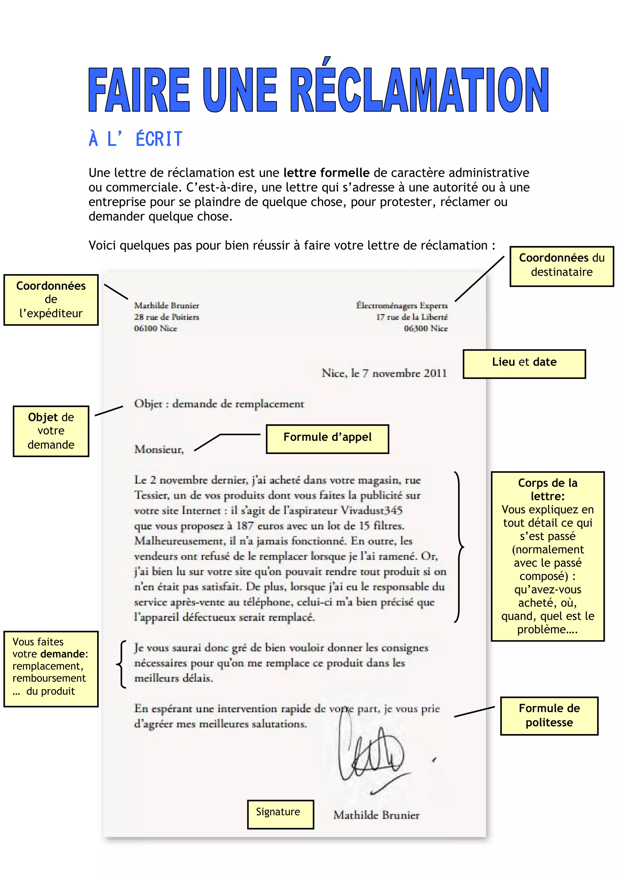 Une lettre de réclamation est un document formel adressé à une autorité ou une entreprise pour exprimer un mécontentement et demander une solution. Elle doit inclure les coordonnées, les détails de la plainte, et une demande explicite (remplacement, remboursement, etc.). Le document fournit également des exemples d'expressions à utiliser pour rédiger une telle lettre, ainsi que des indications sur la manière de faire des réclamations oralement.