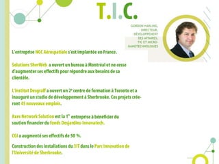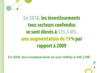 En 2010, les investissements à Sherbrooke s'élevaient à 448,3 millions de dollars, avec un taux de chômage de 7,8 %, en hausse par rapport à l'année précédente. Le secteur industriel a connu une légère baisse de l'emploi, bien que les investissements industriels aient atteint 132,9 millions de dollars. La richesse foncière a augmenté de 19 % pour atteindre 12,6 millions de dollars, et un partenariat significatif a été établi avec la Corée en 2011.