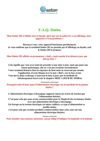 Le document répond à plusieurs questions fréquentes concernant les terminaux Simba, y compris des problèmes d'affichage, de mise à jour et de compatibilité avec les cartes d'abonnement. Il fournit des solutions pour résoudre les blocages lors du démarrage, l'activation des satellites, ainsi que des conseils pour la mise à jour du système. Les utilisateurs sont également guidés sur les spécificités des alimentations électriques et des antennes motorisées.