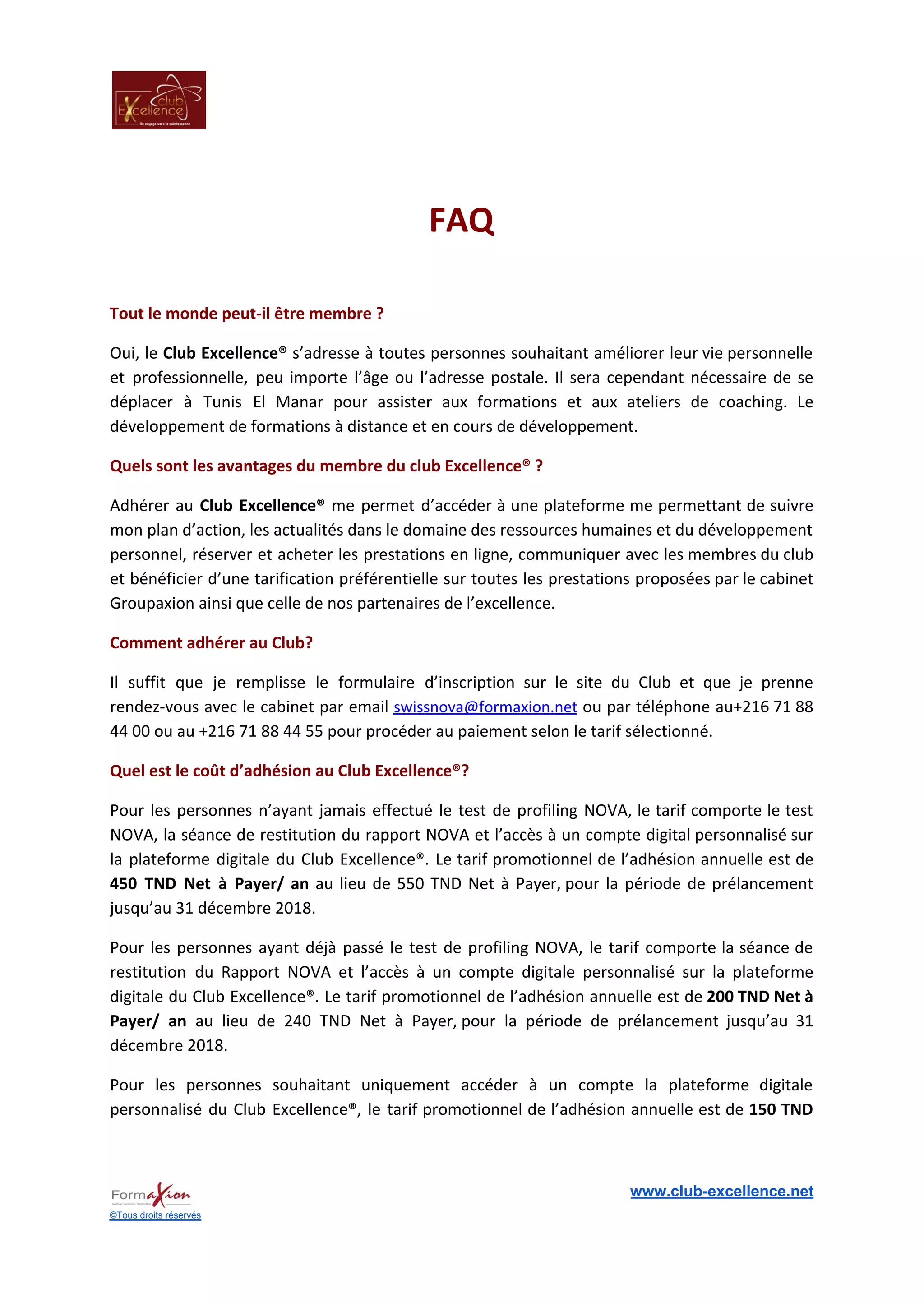 Le Club Excellence® est accessible à tous ceux souhaitant améliorer leur vie personnelle et professionnelle, avec des formations principalement sur place à Tunis El Manar. Les membres bénéficient d'une plateforme pour suivre leur plan d'action, accéder à des formations, et profitent de tarifs préférentiels sur divers services. L'adhésion, soumise à un tarif promotionnel, donne accès à des outils comme le test de profiling Nova, et comprend plusieurs avantages dont des offres de partenaires spécialisés en développement personnel et professionnel.