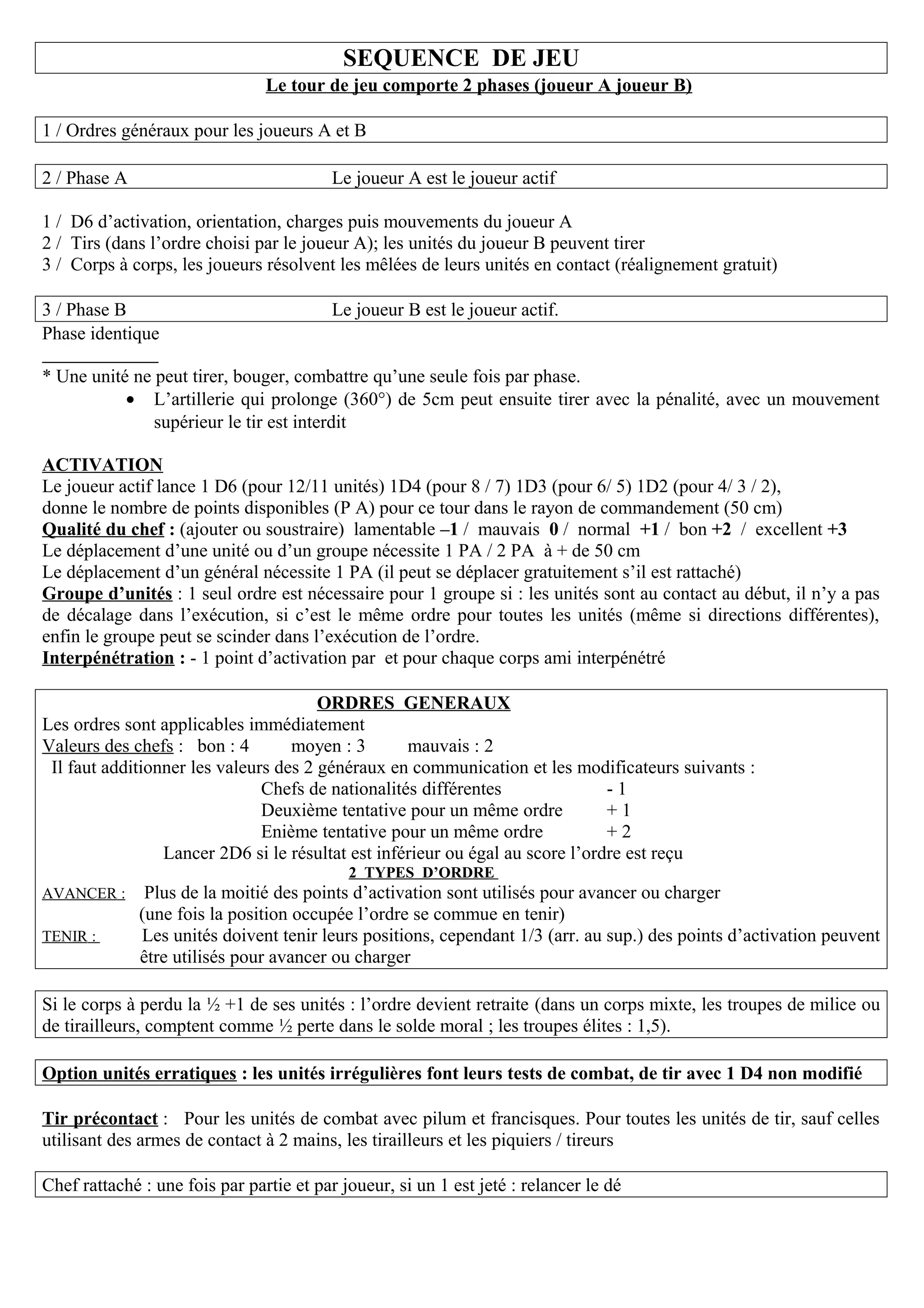 Le document détaille les règles d'un jeu de stratégie en tour par tour, comprenant des phases d'activation pour chaque joueur, des systèmes de mouvement, de tir et de corps à corps, ainsi que des mécanismes d'activation et d'ordres. Les unités ont différents types de capacités, de mouvements et de résilience, influencées par la qualité du chef et les conditions du terrain. Des situations spécifiques comme l'esquive, le débordement et les combats dans des zones protégées sont également décrites pour une gestion fine des combats sur le terrain.
