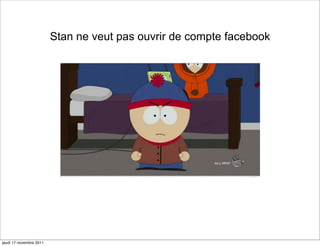 Le document traite de l'expérience de Cartman avec Facebook, où il fait face à des problèmes d'intimité avec son père et de jalousie dans sa relation amoureuse. Il explore les défis liés à la gestion de son profil, l'augmentation de son réseau social et les complications qui en découlent. Finalement, il ressent une frustration suffisante pour envisager la suppression de son compte.