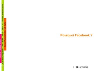 Le document présente des stratégies pour améliorer l'image de marque et les résultats d'entreprises sur Facebook, en soulignant l'importance de la présence en ligne et l'interaction avec les clients. Il fournit des exemples de benchmarks de pages Facebook avec divers niveaux d'engagement, ainsi que des services offerts par Armania pour gérer et animer ces pages. Des cas concrets illustrent les résultats positifs obtenus grâce à des stratégies spécifiques d'animation et de contenu.
