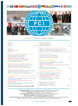 Le magazine de la Fédération Cynologique Internationale (FCI) de mars 2009 couvre divers sujets liés aux chiens, y compris des événements récents, des annonces officielles et des réflexions sur l'avenir de la cynologie. Il aborde également la nécessité d'adapter les événements canins pour susciter un plus grand intérêt du public et des sponsors, en envisageant des changements en vue de l'anniversaire de la FCI en 2011. Des discussions sur les allergies alimentaires et des reportages sur des expositions canines en Europe sont également inclus dans cette édition.