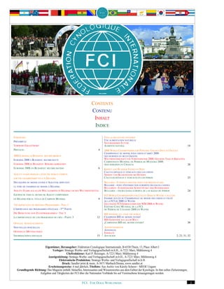 Le magazine de la Fédération Cynologique Internationale (FCI) aborde divers sujets liés aux championnats mondiaux canins et à l'importance des programmes d'élevage. Les événements récents incluent la compétition d'agilité avec une forte participation internationale et des préoccupations croissantes concernant la situation des chiens dans le monde. Le document souligne aussi une tendance à la hausse dans le domaine cynologique malgré les défis économiques.
