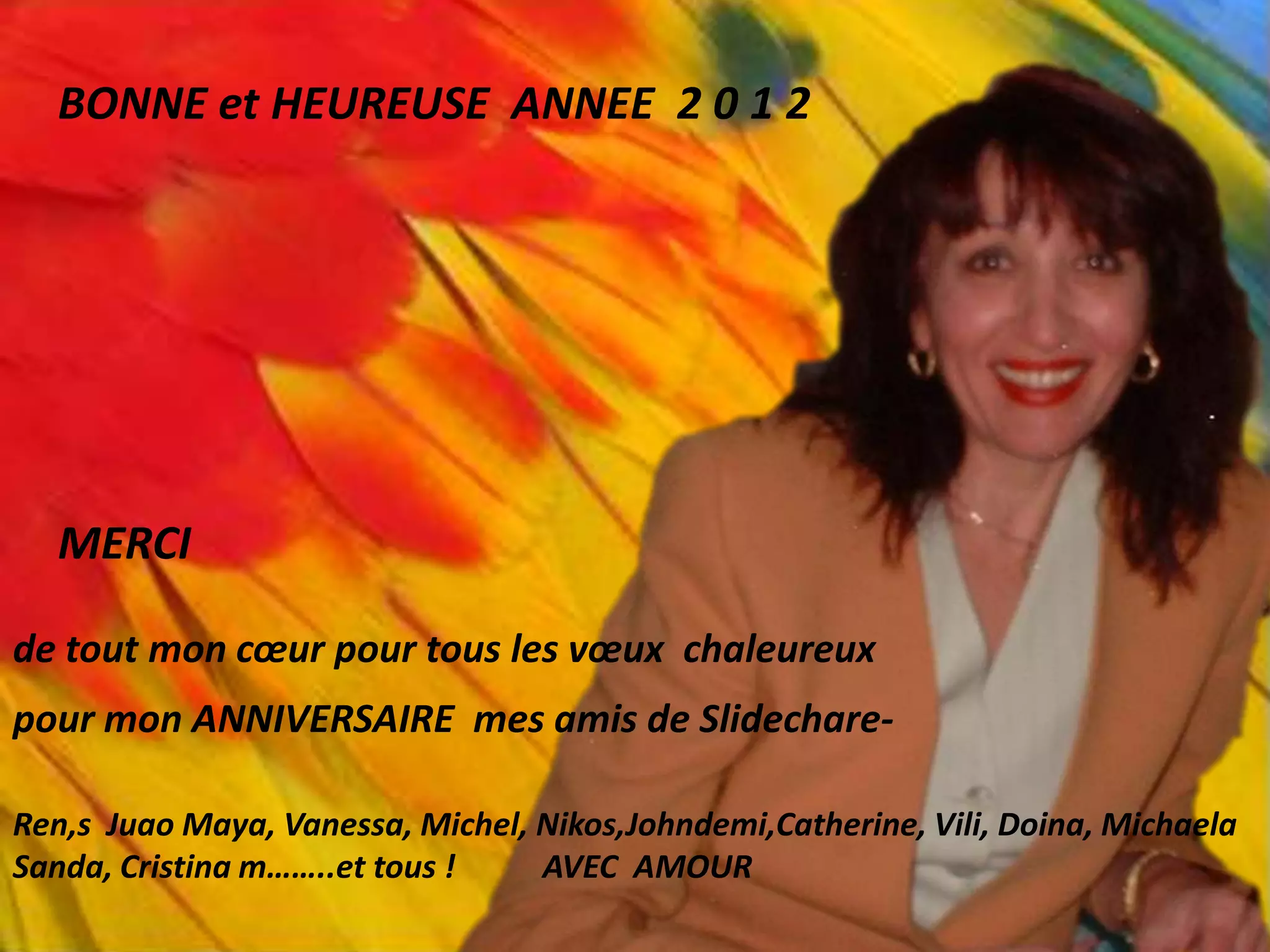 L'auteur exprime sa gratitude pour les vœux d'anniversaire reçus de ses amis. Il souhaite également une bonne et heureuse année 2012. Le message est rempli d'amour et d'appréciation.