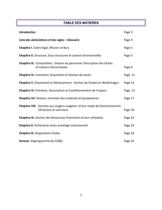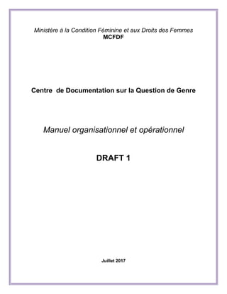 Le document présente le manuel organisationnel et opérationnel du Centre de Documentation sur la Question de Genre (CDQG) du ministère à la condition féminine et aux droits des femmes en Haïti, établi conformément à la loi organique du ministère. Il décrit la mission, la structure, la gestion du personnel, et les activités du CDQG, qui vise à collecter, archiver et rendre accessible la documentation sur la question de genre pour des acteurs étatiques et non étatiques. Le manuel souligne l'importance d'une documentation organisée et de la prise en compte des données sexo-spécifiques pour lutter contre les inégalités de genre.