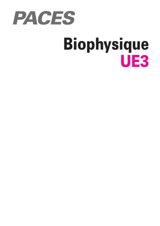 Le document est un manuel de biophysique qui couvre divers sujets allant des solutions aqueuses et de la thermodynamique chimique à la biophysique cardiaque et aux radiations ionisantes. Il est divisé en plusieurs chapitres, chacun contenant des exercices et corrigés, et aborde des concepts fondamentaux essentiels pour les étudiants en médecine. Les auteurs sont des professionnels expérimentés dans leurs domaines respectifs, contribuant à la pédagogie et à la compréhension des sujets traités.