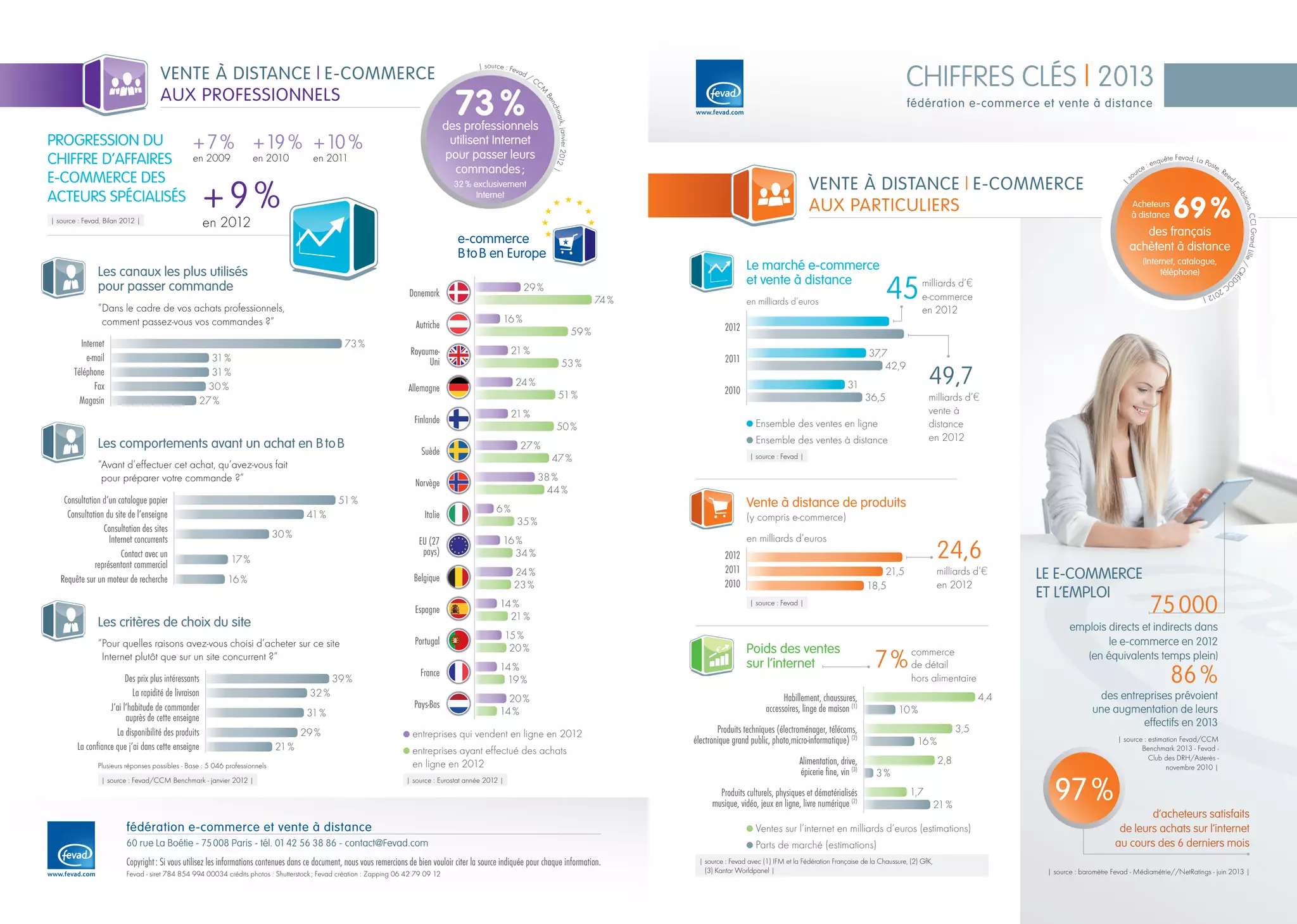 En 2012, le marché français de l'e-commerce a atteint 45 milliards d'euros, avec 69% des Français effectuant des achats à distance par divers canaux, dont Internet à 73%. 97% des acheteurs ont déclaré être satisfaits de leurs achats en ligne, et le secteur a créé 75 000 emplois directs et indirects. La carte bancaire est le moyen de paiement le plus utilisé, représentant 80% des transactions en ligne.