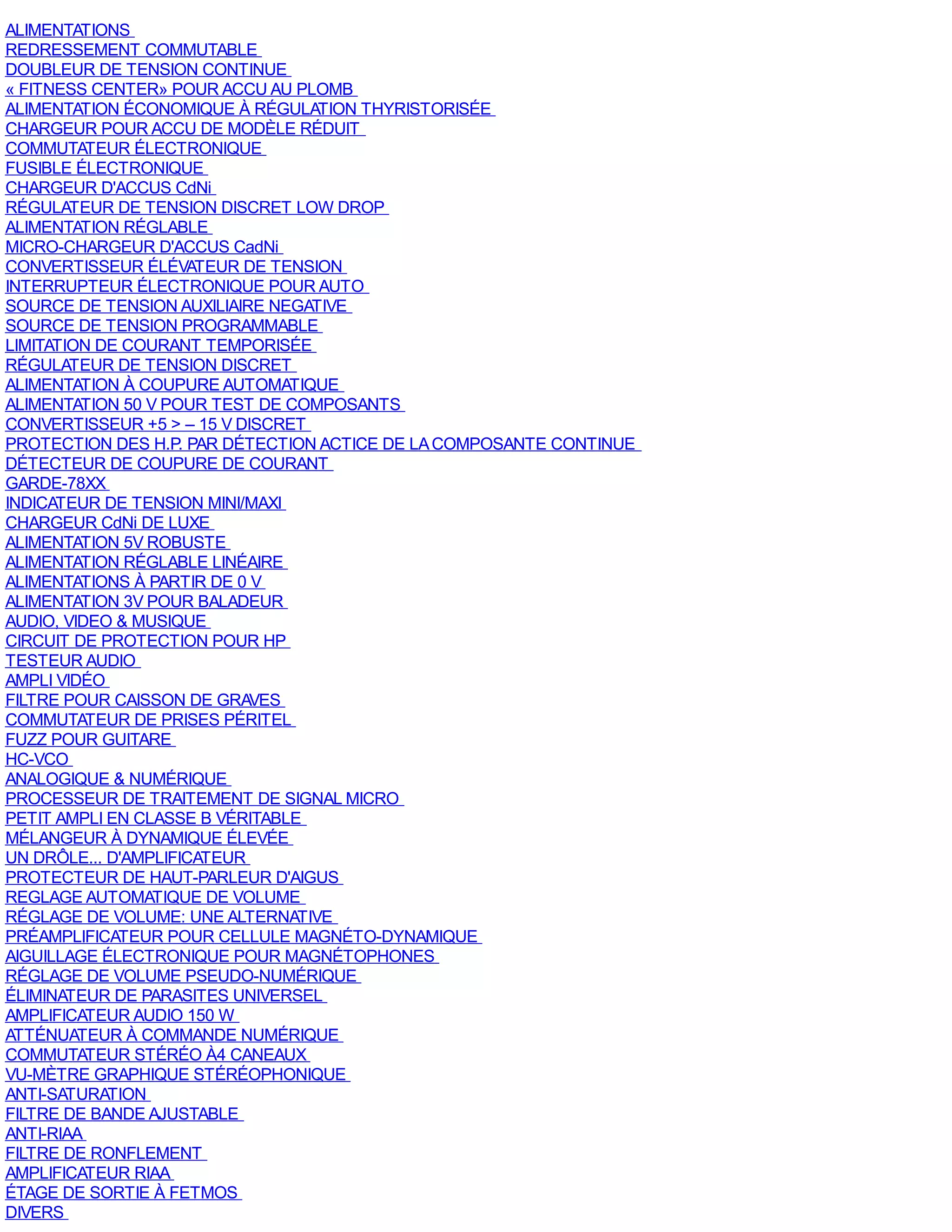 Le document présente une série de circuits et de dispositifs électroniques, spécifiquement axés sur des alimentations, réglages de tension et chargeurs pour accumulators, tout en abordant des concepts d'oscillateurs et de générateurs de signaux. Il explore des solutions techniques pour améliorer l'efficacité et la gestion thermique des régulateurs de tension, ainsi que des conceptions pratiques pour le rechargement et la maintenance des batteries. Une multitude de schémas et de spécifications de composants accompagnent les explications, fournissant des outils pour les amateurs d'électronique et de modélisme.