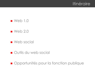 Le document examine l'évolution du web, notamment les différences entre le web 1.0 et le web 2.0, ainsi que l'impact des réseaux sociaux sur la société et la publicité en ligne. Il souligne l'émergence d'outils du web social et leur utilisation croissante dans divers contextes, y compris la fonction publique. Enfin, il suggère des opportunités pour appliquer ces technologies dans l'organisation et la communication gouvernementales.