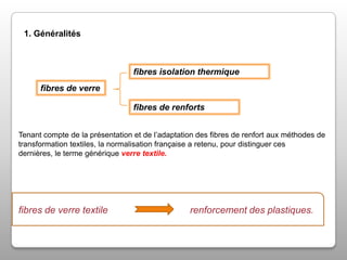Le document traite des différentes fibres de renforcement, en particulier les fibres de verre, et de leur processus de fabrication comprenant la composition, la fusion et le fibrage. Il détaille également les étapes de production, incluant le traitement de surface appelé ensimage, qui améliore la performance des composites. Enfin, il souligne l'importance de ces fibres dans le renforcement des plastiques et leur adaptation aux méthodes de transformation textiles.