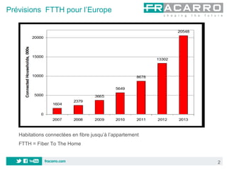 Le document présente des prévisions sur l'extension de la fibre optique FTTH (Fiber to the Home) en Europe, mettant en avant ses avantages tels qu'une bande passante élevée et une faible atténuation. Il décrit également de nouveaux produits innovants pour la distribution de signaux terrestres et satellitaires en utilisant la fibre optique. Enfin, il détaille divers composants, des exemples d'installation ainsi que les points forts de ces solutions.